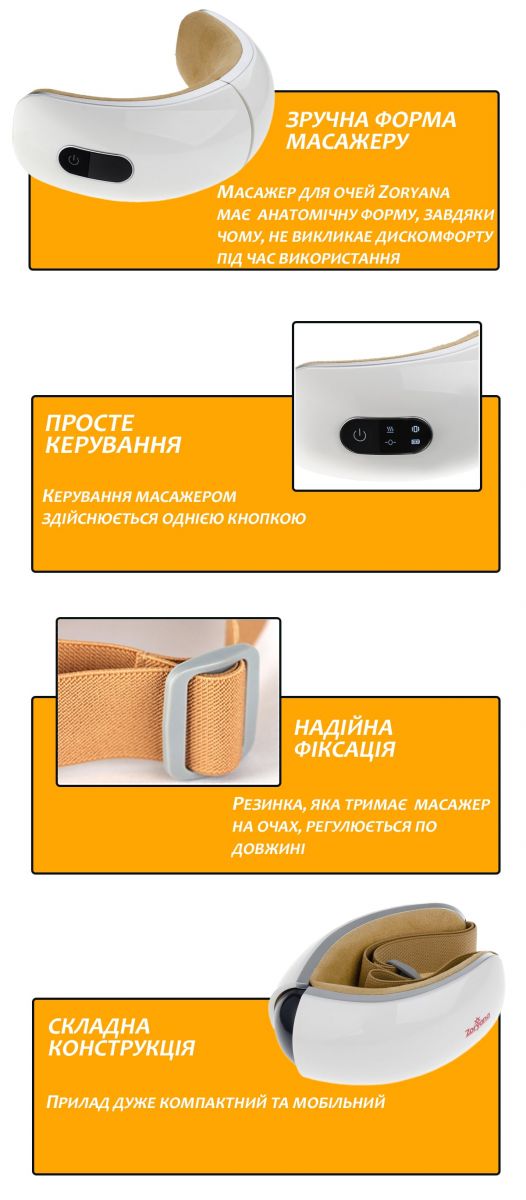 - Повного заряду вистачає більш ніж на 4 години безперервного масажу. Завдяки цьому масажні окуляри Zoryana можна використовувати в будь-який час і в будь-якому місці;