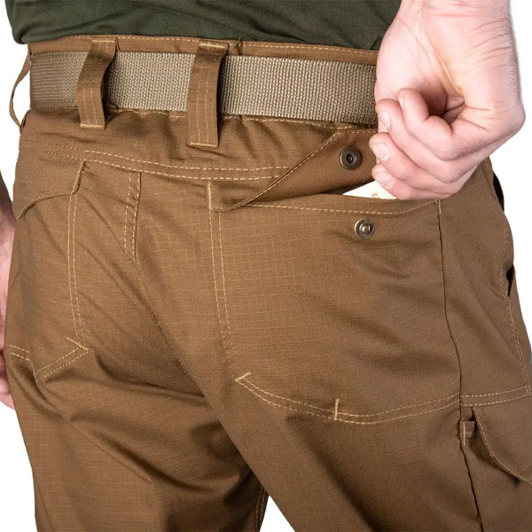 Данная модель тактических штанов имеет 6 карманов, стратегически размещенных по всей длине изделия: два задних, прикрытые клапанами на заклепках, удобные передние карманы, правый боковой карман имеет разделение для телефона и фонарика или складного ножа, левый боковой карман также имеет еще и замок, инструменты, гаджеты, карты, ручки и даже мобильные устройства.
